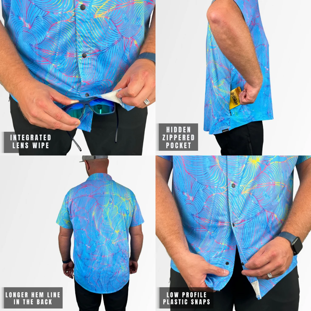 Introducing the Men’s Catalyst Mountain Bike Button-Down Shirt in Dropical Oil Slick: The Ultimate Blend of Style and Performance! Don’t stress over the button down vs. button up debate—labels don’t matter when you have a shirt as incredible as the Catalyst! It’s a button-down shirt with a twist—it’s actually a high-performance jersey in disguise, combining classic charm with functionality. Packed with features like a front stash pocket, a built-in lens wipe, and strong reinforced snaps, this 100% recycled shirt is perfect for your cycling adventures. Experience a natural cooling sensation with 6% Silver Ion content and bid farewell to odors with silver-based antimicrobial control. Get ready to ride in style and comfort!