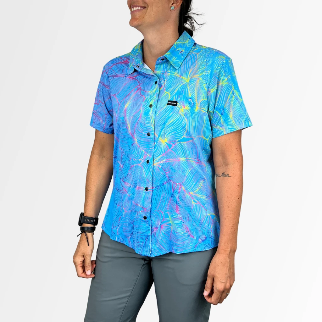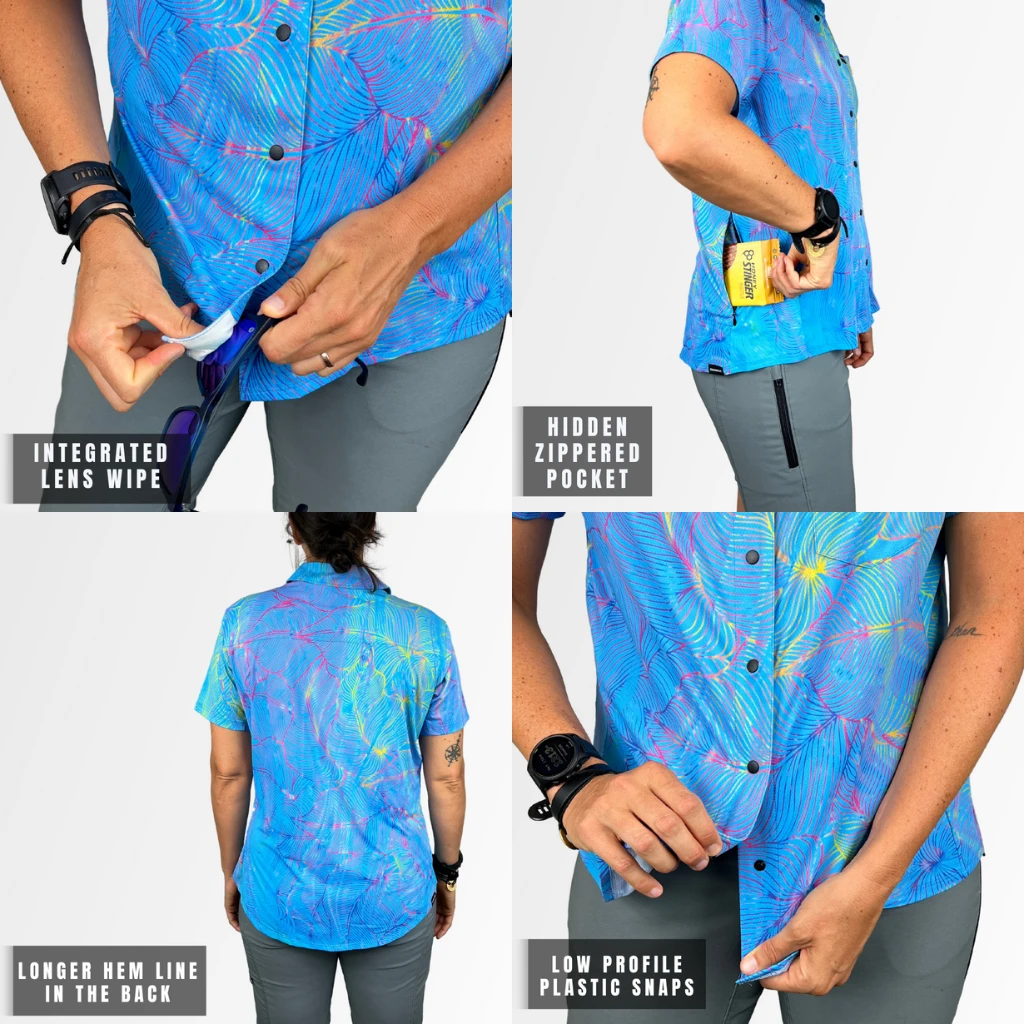 Introducing the Women’s Catalyst Mountain Bike Button-Down Shirt in Dropical Oil Slick: The Ultimate Blend of Style and Performance! Don’t stress over the button down vs. button up debate—labels don’t matter when you have a shirt as incredible as the Catalyst! It’s a button-down shirt with a twist—it’s actually a high-performance jersey in disguise, combining classic charm with functionality. Packed with features like a front stash pocket, a built-in lens wipe, and strong reinforced snaps, this 100% recycled shirt is perfect for your cycling adventures. Experience a natural cooling sensation with 6% Silver Ion content and bid farewell to odors with silver-based antimicrobial control. Get ready to ride in style and comfort, ladies!